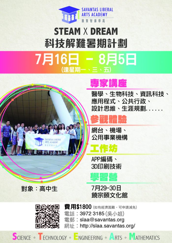 「STEAM X Dream 科技解難暑期計劃」旨在透過多元化學習體驗 (包括講座、參觀、工作坊、學習營),啟發學生對科技、人文學科和社會議題的興趣,認識香港回歸以來各方面的發展,學習利用知識應對各種挑戰,同時認識不同行業發展情況,進行生涯規劃,實踐夢想 (dream)。 > 詳情