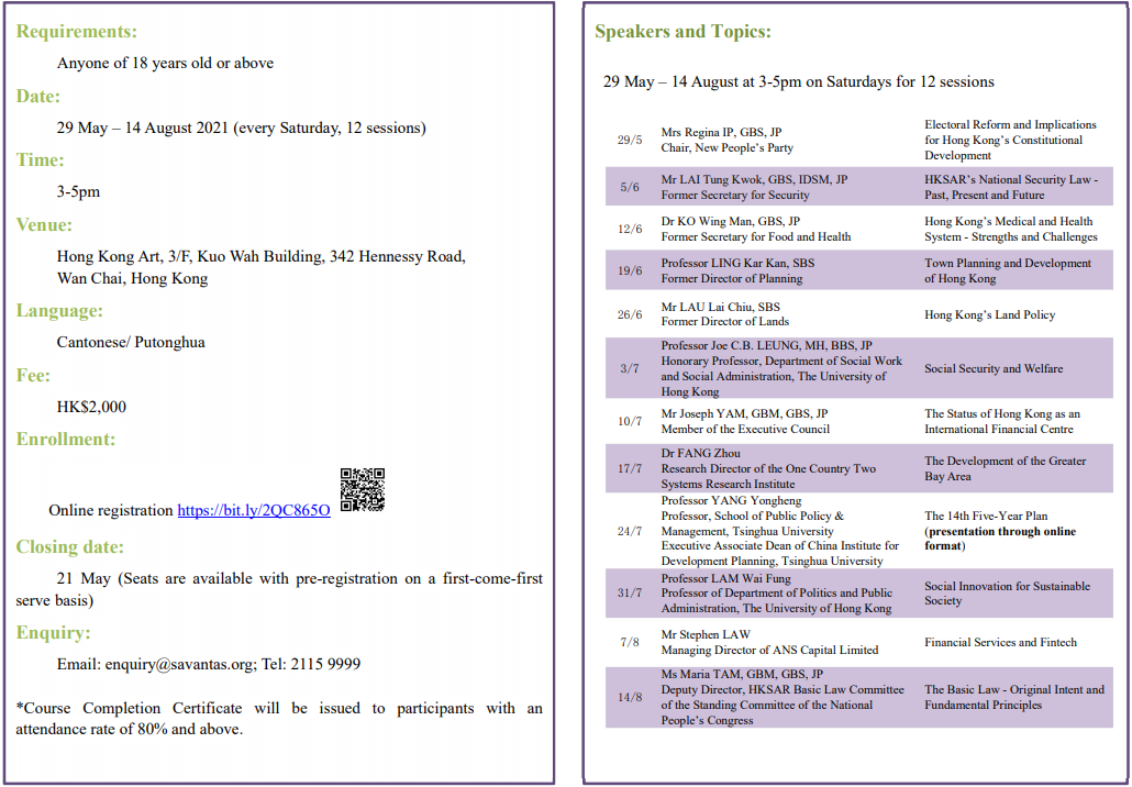Since its establishment in 2009, Savantas Liberal Arts Academy has dedicated itself to promoting understanding of politics and public policies, including the advancement of quality democracy under “One Country, Two Systems”. The Public Policy Study Programme to be launched in late May will bring together a highly diverse group of experts with deep experience in public policy-making and implementation. SLAA believes that through participation in this intensive, 12-week programme, both the teachers and students will be able to work together to deepen understanding of the political, social and economic challenges facing Hong Kong and identify workable solutions.