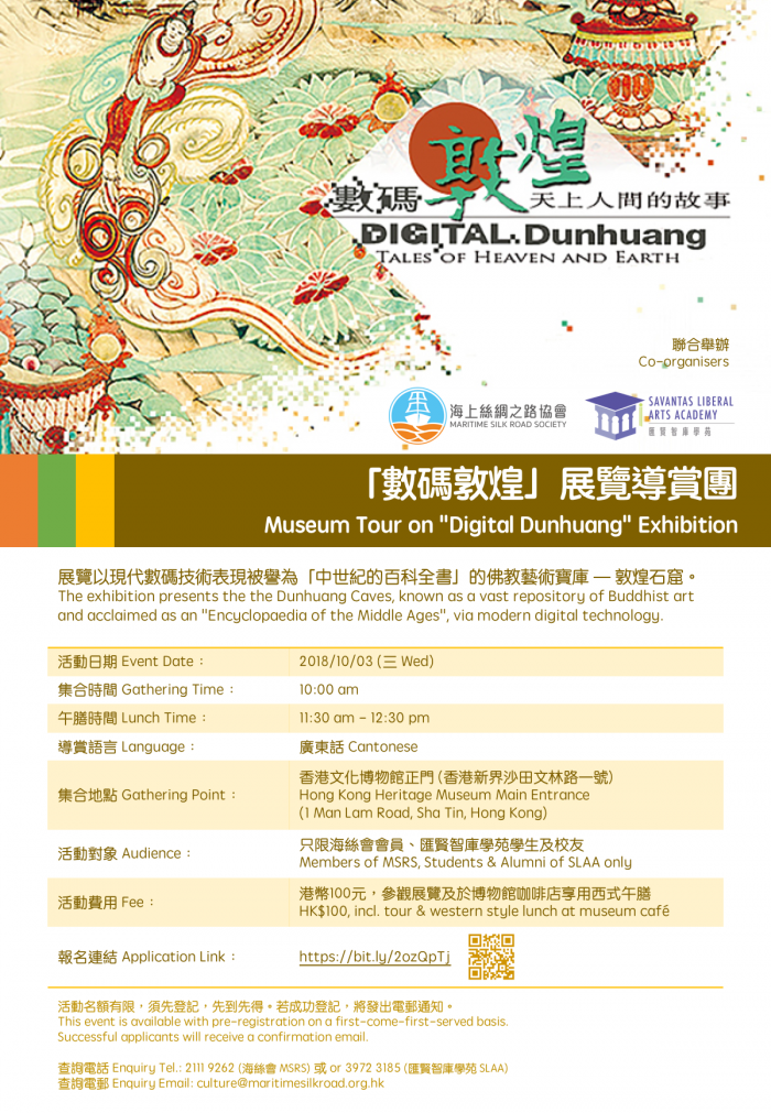 Maritime Silk Road Society (MSRS) and Savantas Liberal Arts Academy (SLAA) are organising the Museum Tour on “Digital Dunhuang” Exhibition. The exhibition presents the the Dunhuang Caves, known as a vast repository of Buddhist art and acclaimed as an “Encyclopaedia of the Middle Ages”, via modern digital technology.