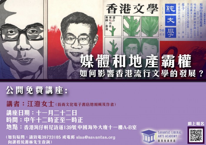 學苑有幸邀請到首尚文化電子書店總編輯及作者 江澄女士分享她的經驗與心得,講座題目為: 「媒體和地產霸權如何影響香港流行文學的發展?」