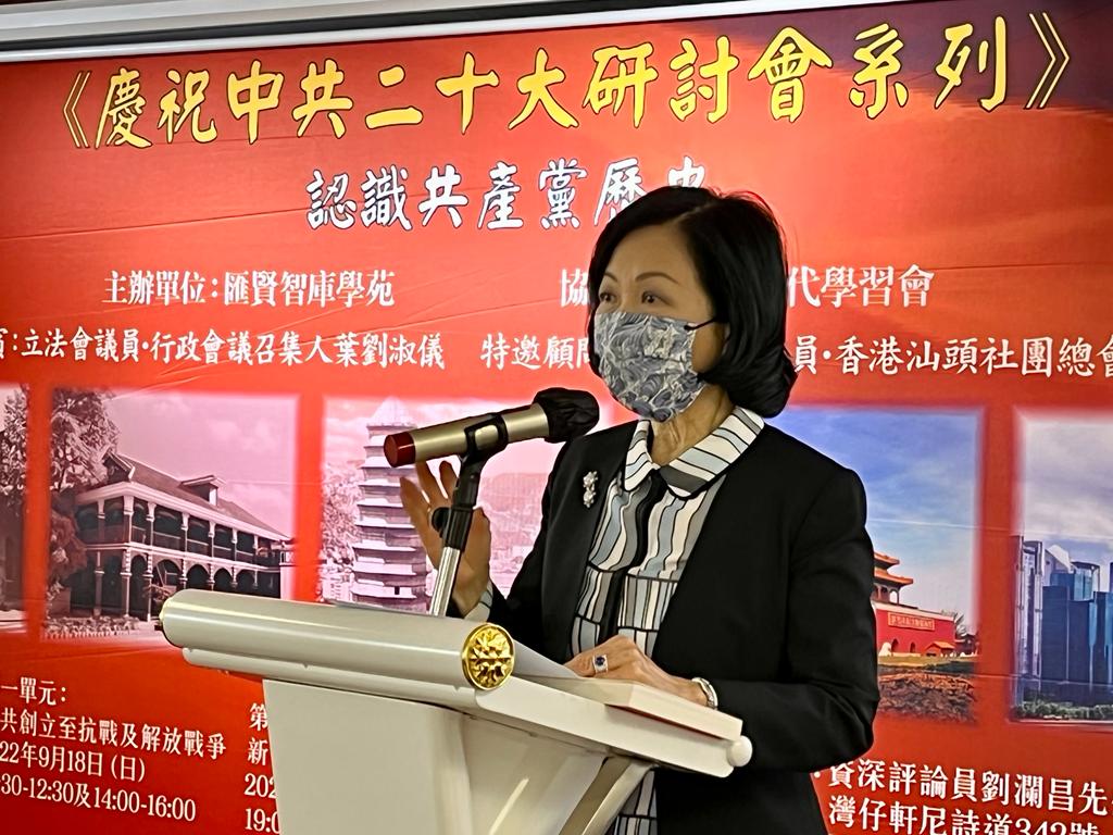 中共二十大快將召開。葉劉淑儀女士強調當大家期待黨和國家未來發展的具體方案時,現在正是學習和了解中國共產黨偉大百年歷史的好時機。