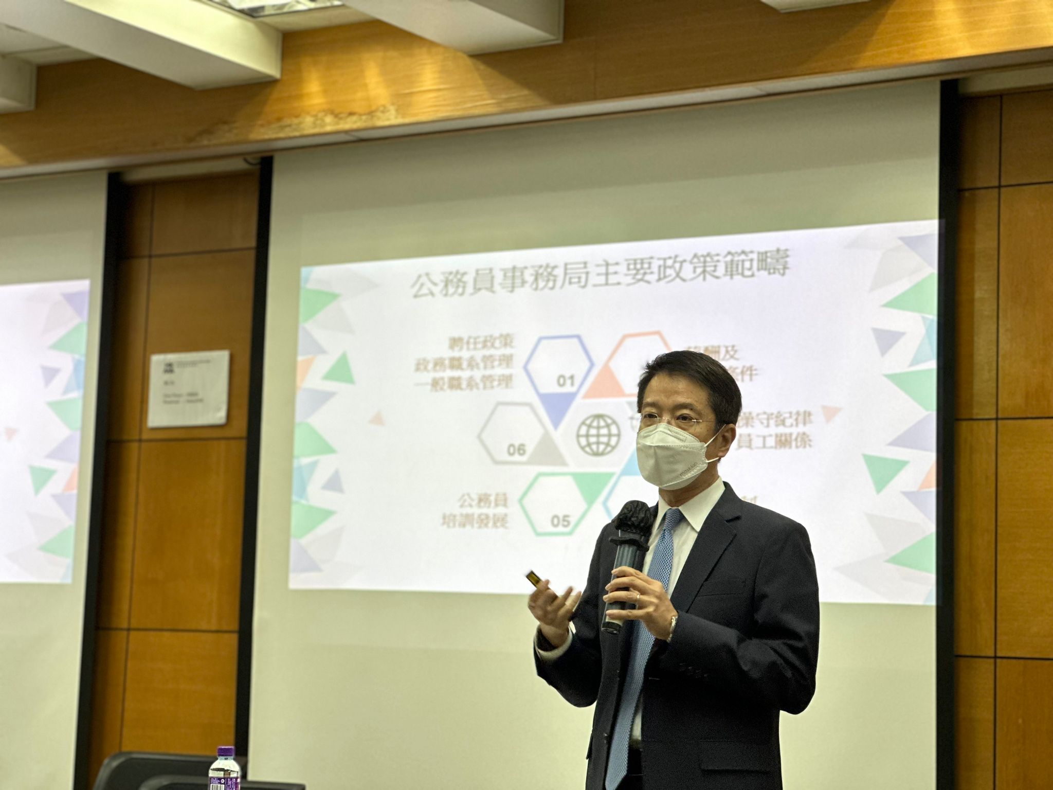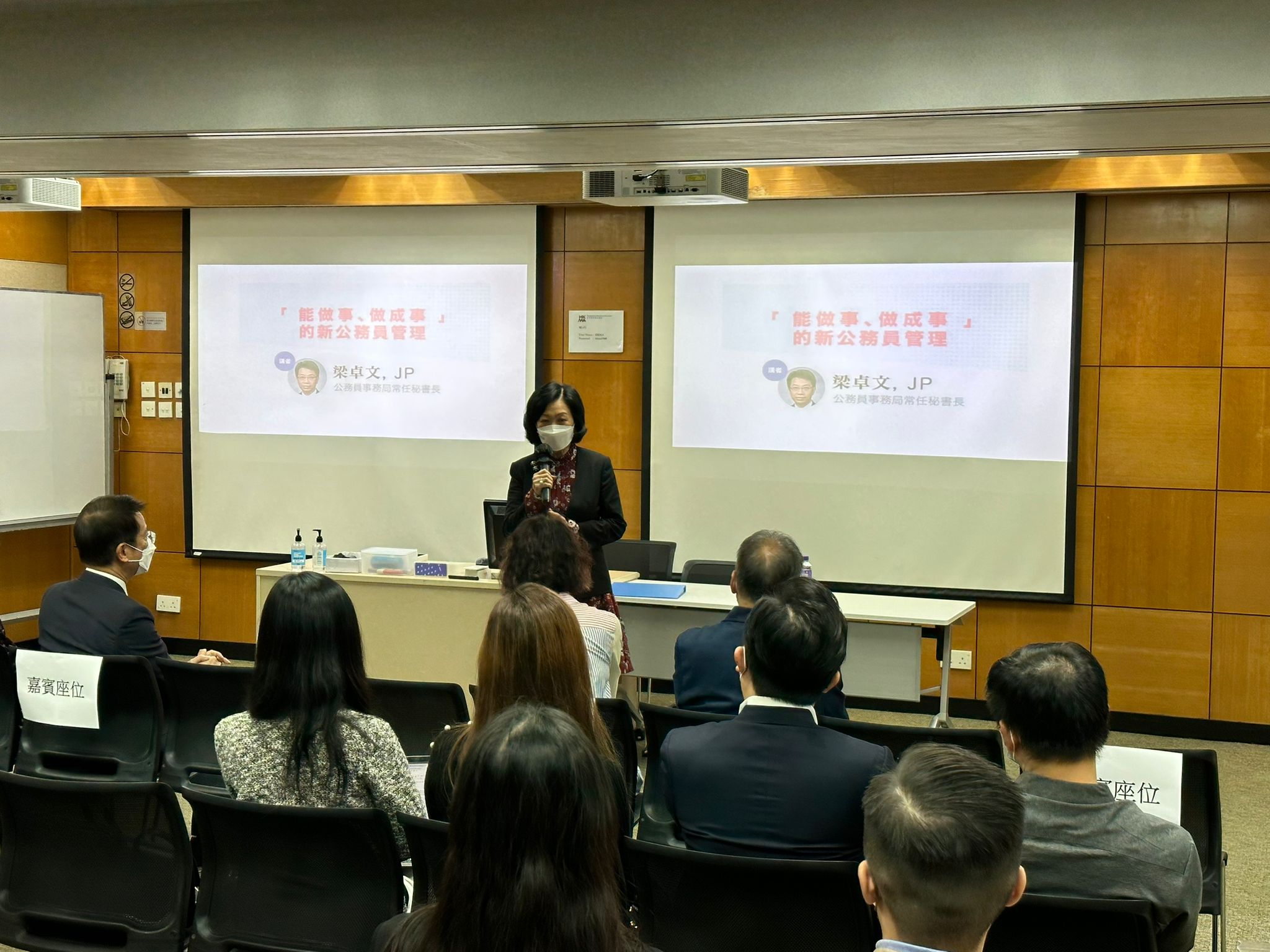 梁卓文先生以「政府人事管理」爲题,介绍了公务员事务局的工作。他提到人事管理是各级人员的核心工作。在日本文化,人事管理是高层管理人员重要的工作。公务员事务局的主要政策範畴包括:一、聘任政策、政务职系管理及一般职系管理;二、薪酬及服务条件;叁、操守纪律及员工关係;四、政府编制;五、公务员培训发展;及六、2019冠状病毒病疫苗接种计划。《行政长官2022年施政报告》提出四方面优化公务员管理,包括:更新《公务员守则》、强化赏罚制度、强化公务员培训及优化现行动员机制。最後,梁卓文先生分享了一些对公务员的迷思与事实,并透过问答环节解答了与会者有兴趣了解的问题,例如政府在抢人才和种族共融方面的工作、投考政务主任和纪律部队的「温馨提示」等。